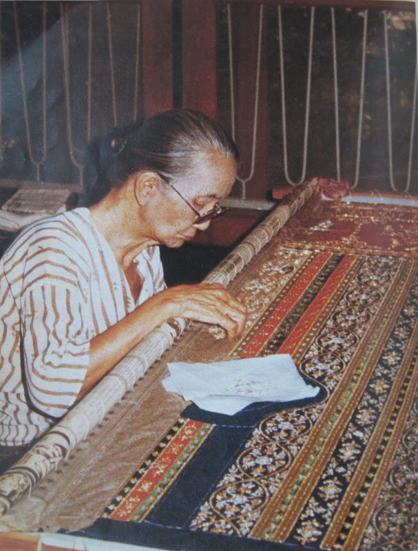 นี่คือรูปตอนที่ท่านได้ปักผ้าห่มนาง เมื่อปีพ.ศ.2520-2521 ตอนนั้นท่านก็มีอายุ89ปีแล้ว ผ้าห่มนางผืนนี้ได้ใช้ ในงานวันนริศ ในการแสดงละครดึกดำบรรพ์ เรื่องรามเกียรติ์ ตอนศูรปนขาตีสีดา อ.จักรพันธุ์ โปษยกฤต ที่เพิ่งเป็นลูกศิษย์ครั้งแรกก็ครั้งนี้ ได้เล่าว่าท่านอ.เยื้อน ใช้เวลา8เดือนจึงสำเร็จลุล่วงไปด้วยดี พอได้นำออกแสดงจริง เป็นที่เลื่องลือว่าผ้าห่มนางผืนนี้งามมิมีที่ติ ผู้ที่ห่มผ้าห่มนางผืนนี้คือ ม.ร.ว. รัศมี ดิศกุล นันทาภิวัฒน์