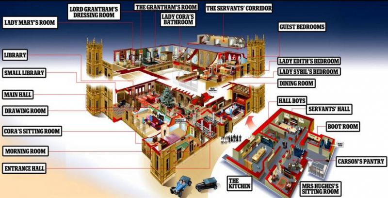 ผังปราสาท Highclere ที่ใช้ถ่ายทำฉาก upstairs ส่วน downstairs เป็นฉากในโรงถ่าย
