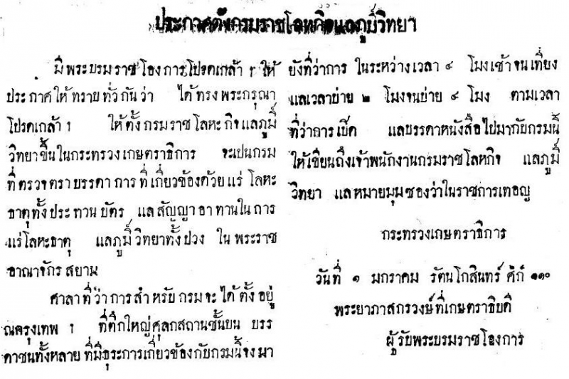 คัดจากหนังสือจัดตั้งกระทรวงเกษตราธิการ กล่าวไว้ว่า เดิมทีการอนุญาตให้ทำเหมืองแร่นั้น เจ้ากระทรวงหัวเมืองเป็นผู้จัดการ มีทั้งทำเองและทำโดยพลการก็มี จึงได้จัดตั้งกรมราชโลหกิจและภูมิวิทยา ขึ้น เมื่อ ร.ศ. ๑๑๐ โดยมีผู้ดูแลคือ เจ้าพระยาภาสกรวงศ์ และได้รับมิสเตอร์ อิ เต มูเลอร์ ชาวเยรมัน และมิศเตอร์ เอช วาริงตันสไมท์ ชาวอังกฤษ มารับราชการในกรมในตำแหน่งเจ้ากรม และผู้ช่วยเจ้ากรมตามลำดับ