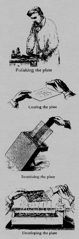 ในวันนั้น ช่างภาพทุกคน ที่ออกภาคสนาม จะต้องพกห้องมืดติดตัวไปด้วย ของหลักๆ ที่จะต้องมี ก็คือกระโจมห้องมืดแบบครึ่งตัว ใช้ทำกระจกให้กลายเป็นแผ่นไวแสง นั่นแปลว่า ท่านจะต้องมีน้ำยาเคมีไปอีกหลายขวดใหญ่ มีอ่างรองรับน้ำยา มีคีมคีบ มีถุงมือ ผ้า และอะไรอีกจิปาถะ ทั้งหมดต้องพร้อมใช้งาน เพราะสมมติว่า เดินป่าเข้าไป 3 วัน แล้วดันลืมนำยาไฮโป งานของกร่อยไม่เป็นสับปะรส แต่ในบันดาของทั้งหมด กระจกจึงเป็นหัวใจครับ