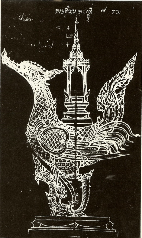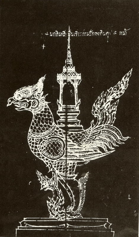 7.นกหัสดิน(นกหัสดี ,นกหัสดีลิงค์) เป็นชื่อนกใหญ่ชนิดหนึ่งในเทวนิยายว่า อาศัยอยู่ในป่าหิมพานต์ รูปตัวส่วนใหญ่เป็นนก เว้นแต่จงอยปากเป็นงวงอย่าง งวงช้าง ชื่อนกหัสดีลิงค์ไม่ค่อยปรากฎในเทวนิยาย คนส่วนมากทราบเรื่องนกขนาดใหญ่ในนิยายก็มี เช่น หงส์ พญาครุฑ นกหัสดิน สำหรับนกหัสดินบ้างก็ว่า รูปร้างเป็นนกทั้งตัว ใหญ่โต ขนาดโฉบเฉี่ยวเอาช้างในป่าไปกินเป็นอาหารได้ ไม่เกี่ยวโดยตรงกับนกหัสดีลิงค์นกที่มีจงอยปากเป็นงวงช้างนี้(แต่ในรูปนี้มีงวงเป็นช้าง)ถ้าเป็นนกหัสดีลิงค์ ปรากฏในภาษาบาลีว่า หัตดีลิงค์สกุโณ (หัตดี คือ ช้าง ลิงค์ แปลว่า เพศ สกุโณ แปลว่า นก) ในภาษาสันสกฤต คือ หัสดิน ลิงคะ แปลอย่างเดียวกัน ไทยเลือกใช้คำว่า หัสดีลิงค์ แปลกที่คำนี้ไม่มีในปทานุกรม กรมตำรากระทรวงธรรมการ พิมพ์ พ.ศ.2470 ไม่มีในพจนานุกรมฉบับราชบัณฑิตยสถาน พ.ศ.2493 และ พ.ศ.2525 ค้นคว้าต่อไปพบในอักขราภิธานศรันท์ ของหมอปรัดเล พิมพ์ พ.ศ.2416 หน้า 328 และพบในปทานุกรม บาลีไทย-อังกฤษ-สันสกฤต ของกรมพระจันทบุรีนฤนาถ ฉบับพิมพ์ พ.ศ.2513 หน้า 867 หรือแม้ในบาลีสยามอภิธานของนาคะประทีป เรียบเรียงไว้ พ.ศ.2465 ก็มีปรากฏคำนี้อยู่ แสดงว่าคนไทยเรารู้จักคำนี้มานาน พจนานุกรมภาคอีสาน - ภาคกลาง ฉบับปฏิธาน สมเด็จพระมหาวีรวงศ์ (ติสโส) ก็รักษาคำนี้ไว้ ชาวอีสานรุ่นเก่า รู้จักนกหัสดีลิงค์ โดยเหตุที่งานศพเจ้านายผู้ใหญ่ พระเถระผู้ใหญ่ หรืองานศพท่านผู้มีวาสนาบารมีสูงยิ่ง มักจัดงานศพโดยสร้างรูปนกหัสดีลิงค์ มีพิธีบวงสรวงก่อนสร้างรูปนก นกนั้นขนาดใหญ่ รองรับหีบศพได้ นิยมสร้างในวัดใกล้บ้านผู้ตาย จัดหาช่างและวัสดุเครื่องสังเวยให้พร้อม เพียงแต่เริ่มสร้าง ก็เป็นที่สนใจของคนทั่วไป นกนั้นสร้างแบบมีชีวิต เช่น หันศีรษะได้ งวงม้วนได้ ตากระพริบ หูกระดิก มีเสียงร้องได้ด้วย หลังนกมีที่ว่างพอสำหรับพระภิกษุนั่งอ่านคัมภีร์หน้าศพไปด้วย พิธีต้องจัดกระบวนญาตินุ่งขาวห่มขาวตามหลังศพ มีฆ้องดนตรีธงต่างๆ ถ้ามีเครื่องยศของผู้ตาย ก็ต้องเข้าขบวนด้วย เนื่องจากศพแต่ละงานมีฐานะต่างกัน บางงานกำหนดเผาที่วัด บางงานกำหนดเผาที่ทุ่งกลางเมือง การนำศพเคลื่อนจากที่ตั้งกระบวนไปยังที่เมรุ เขานิยมใช้ตะเฆ่รองรับฐานของนกหัสดีลิงค์ มีเชือก 3 สายผูกที่ฐานล่างของนกให้ญาติและชาวบ้านชักลากไป ถ้าเป็นศพเจ้าเมืองหรือศพพระเถระผู้ใหญ่สมัยเก่า เขาเล่ากันว่า คนทั้งเมืองมาช่วยกันลากศพนั้นๆผช้าๆ งานใหญ่ๆ เช่นนี้ สิ่งที่ขาดไม่ได้ คือ โรงทาน น้ำกินน้ำใช้ ต้องบริบูรณ์ตลอดงาน ครั้นศพถึงเมรุ ผู้เข้าพิธีในงานจัดกำลังไว้ยก