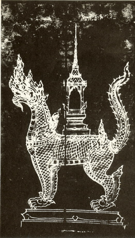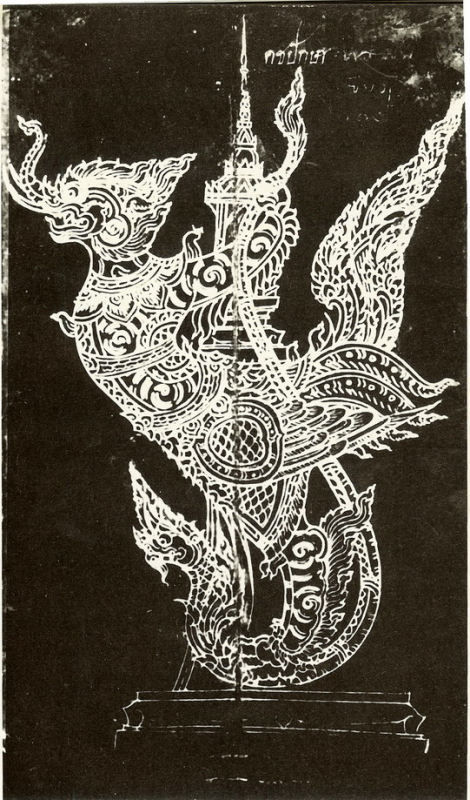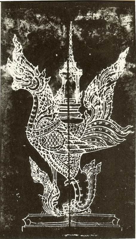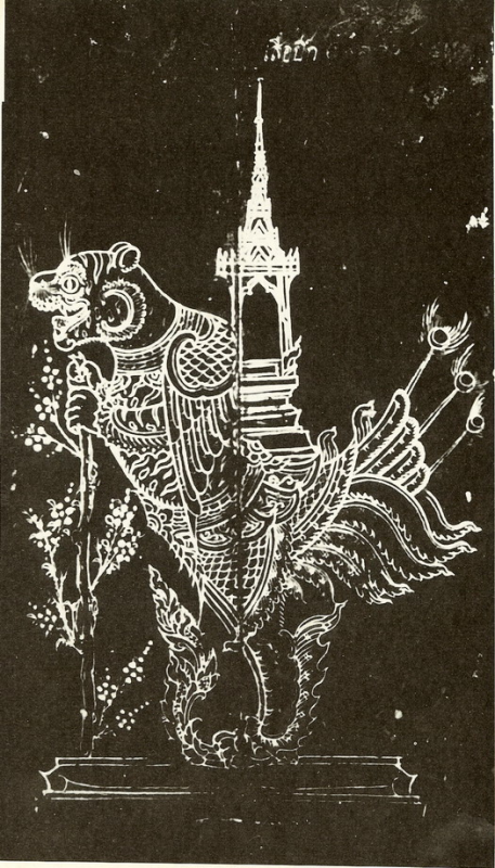 45.นาคาปักษิณ นาคาปักษิณหรือนาคปักษิณเป็นสัตว์กึ่งน้ำกึ่งบก คือเอาส่วนหัวของ "นาค" มาผสมกับส่วนตัวของ "ปักษิณ" ซึ่งแปลตามตัวว่า สัตว์มีปีก ก็คือนกนั่นเอง "นาค" มีความหมายหลายอย่าง แต่ในที่นี้หมายถึงงูใหญ่ในนิยาย ซึ่งเรามักเรียกกันว่า "พญานาค" พญานาคตามทัศนะของจินตกวีและช่างเขียนเป็นงูใหญ่ประเภทมีหงอนและเครา ตามนิยายโบราณมักจะกล่าวถึงพวกนาคมาเกี่ยวข้องกับมนุษย์เสมอ เรื่องของพญานาคมีที่มาเป็นสองทาง คือทางลัทธิพราหมณ์กับทางพุทธศาสนา พญานาคทางลัทธิพราหมณ์ออกจะถือกันว่าเป็นเทวดาแท้ ๆ เช่น พญาอนันตนาคราช และท้าววิรุฬปักษ์ (ดูหนังสือ "เทวนิยาย" โดย "ส.พลายน้อย") ว่าถึงที่อยู่ของพวกนาค ก็มีทั้งที่อยู่บนบกและอยู่ในน้ำ อย่างพญาวาสุกรี ที่อยู่เมืองบาดาลก็ไม่ใช่ในน้ำ เป็นเมืองที่อยู่ใต้โลกมนุษย์ลงไปอีกชั้นหนึ่ง นาคทางคัมภีร์พุทธศาสนามักอยู่ในโลกมนุษย์เรานี้ อยู่ในโพรงบ้าง ในถ้ำบนบกบ้าง อยู่ในน้ำบ้าง อย่างพญานาคชื่อภูริทัต ในมหานิบาตชาดก ก็อยู่บนบก แต่ตามเรื่องไทย ๆ เราว่า พญานาคอยู่ในน้ำกันมาก นาคพิภพที่ว่าอยู่ใต้ดินนั้น มีกล่าวในไตรภูมิพระร่วงว่า "แต่แผ่นดินดันเราอยู่นี้ลงไปเถิงนาคพิภพ อันชื่อว่าติรัจฉานภูมินั้น โดยลึกได้โยชน์ ๑ แล ผิจะนับด้วยวาได้ ๘๐๐ วาแล" นาคปักษิณ หัวเป็นนาค มีหงอน ส่วนท่อนหางเป็นแบบหางหงส์ เพื่อให้รับกับส่วนหัว