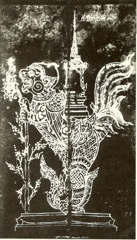 46.กบิลปักษา กบิลปักษา กะบิลปักษา หรือ พานรปักษา มาจาก พานรหรือวานร แปลว่า ลิง และ ปักษา แปลว่า นก รวม หมายความว่า ครึ่งลิงครึ่งนก ในภาพไม่ใช่ภาพลิงธรรมดา แต่เป็นลิงใหญ่ทรงเครื่อง เพื่อเล่นลวดลายได้ และโดยเหตุที่ลิงชอบผลไม้ ช่างจึงให้ถือต้นไม้มีผล(บางตำราว่าถือมะม่วงและชมพู่ )ทำให้น่าดูยิ่งขึ้น ที่พิเศษก็คือในบางตำราถือว่า ทั้งลิงทั้งนกต่างก็มีหาง ผู้เขียนภาพเสียดายหางลิงไม่กล้า ตัด ก็เลยทำให้มีทั้งสองอย่าง เมื่อหางลิงตวัดขึ้น หางนก หรือหางไก่ก็ห้อยลง แต่ในตำราฉบับนี้มีหางเป็นอย่างนกหรือไก่และมีปีกอย่างนก
