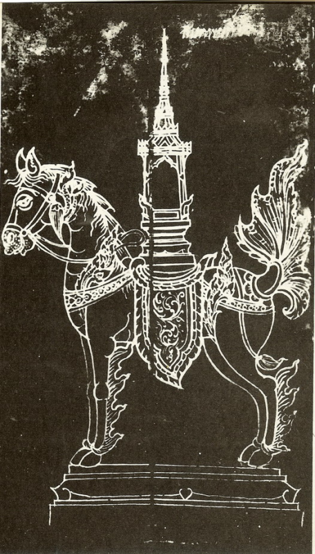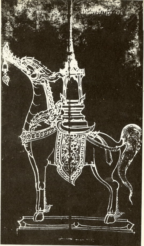 41.ม้ารีศ ม้ารีศหรือมารีศเป็นลูกของนางกากนาสูร มีพี่น้องร่อมอุทรเดียวกัน คือสวาหุ เป็นยักษ์ที่ได้ชื่อว่ากลัวพระรามมาก เพราะเมื่อ ครั้งสู้รบกับพระราม พระลักษมณ์ เพื่อแก้แค้นแทนแม่ที่ ถูกพระรามแผลงศรจนตาย แต่ก็ไม่สามารถเอาชนะได้ เมื่อเห็นสวาหุพี่ชายต้องศรพระรามตาย อารามตกใจแล เห็นพระรามมีสี่กร จึงเหาะหนีไป แต่กระนั้นก็ยังถูกทศกัณฐ์ บังคับให้แปลงเป็นกวางทองไปล่อนางสีดาออกมาจากอาศรม นางสีดาเมือเห็นกวางทองก็ทูลขอให้พระรามจับให้ พอจับได้ พระรามก็รู้ทันทีว่าเป็นมารีศจึงแผลงศรต้องกายมารีศ แม้มารีศจะเจ็บแทบขาดใจก็ยัง ทำเสียงเป็นพระราม ร้องหลอกให้พระลักษมณ์ตามมาดู ทศกัณฐ์จึงลัก นางสีดาไปโดยง่าย จากนั้นมารีศก็ขาดใจตาย ในรูปเขียนร่างกายช่วงบนเป็นยักษ์มงกุฎกระหนกช่วงล่างเป็นกวางกางเป็นอย่างราชสีห์ถือกระบองยักษ์ดูพิสดารยังไงอยู่