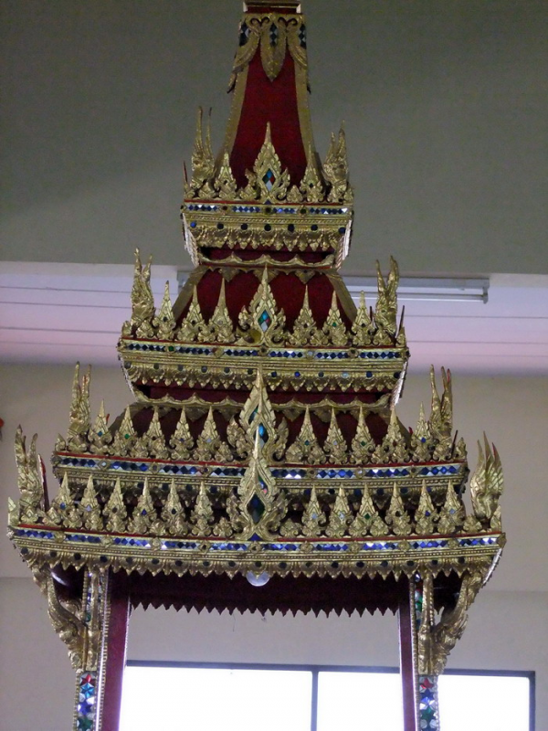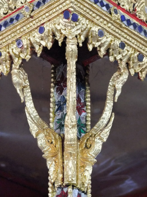 แต่ที่น่าเสียดายครือบางส่วนถูกซ่อมใหม่ กระจกสีทำใหม่ และบางส่วนปั้นอีฟอกซี่เพิ่มลายจนเสีย และติดลายกระจังที่ถอดได้กับตัวธรรมมาสจนถอดไม่ได้เลย แต่ก็ยังถือว่าสมบูรณ์มากครับ ส่วนเครื่องบนเป็นของเดิมเกือบทั้งหมดยกเว้นลายกระจังบางตัวที่แกะใหม่ และยอดนาคบางลายปั้นอีฟอกซี่เพิ่มครับ