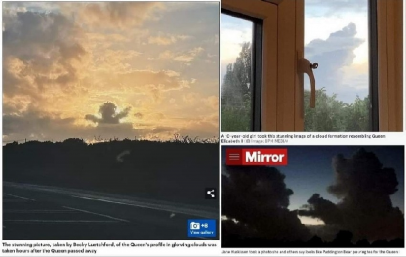 pareidolia ที่อังกฤษ  ภาพถ่ายเมฆของ Leanne Bethell หญิงสาวชาวอังกฤษ หลังจากที่ควีนอลิซาเบาที่ ๒ เสด็จสวรรคตราว ๑ ชั่วโมง ช่างคล้ายคลึงควีนผู้ล่วงลับอย่างน่าประหลาด ภาพจาก Daily Telegraph