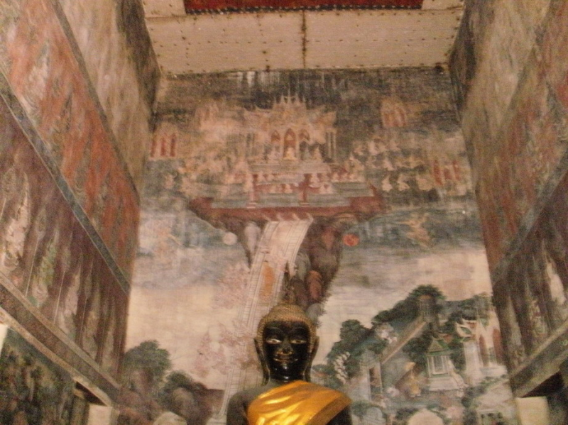 หลังพระประธานเป็นรูปเขียนเรื่องพระพุทธเจ้าเสด็จลงจากสวรรค์ชั้นดาวดึงส์