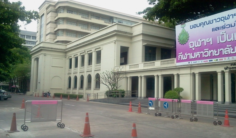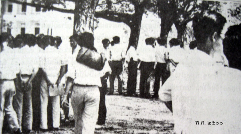 ภาพนี้ถ่ายไว้เมื่อ พ.ศ. ๒๕๐๐  เป็นเหตุการณ์ที่นิสิตจุฬาประท้วงทางการเมืองสมัยนั้น จึงรวมตัวกันและประท้วงรัฐบาลด้วยการลดธงครึ่งเสา จะเห็นแนวต้นจามจุรี น่าจะถ่ายหน้าตึกจักรพงษ์ จนถึงตึกคณะวิทยาศาสตร์