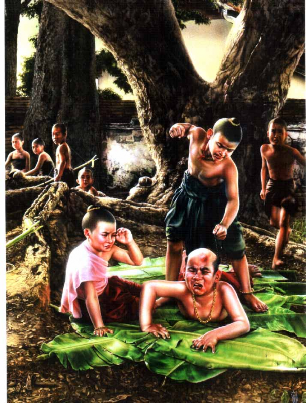ในภาพแรกนี้ มองภาพหลักแล้วเป็นกลุ่มเด็กสามคน คนหนึ่งนั่งร้องไห้ สวมสไบ ผมสั้นเกรียนไว้จุกเป็นเด็กหญิง ยกมือเช็ดน้ำตา ด้านข้างเป็นเด็กชายสองคน คนหนี่งคะมำกับพื้น หัวล้านไว้ผมแกละ สวมสร้อยทองเส้นโต หน้าผากปูดบวมแดง กำลังร้องไห้อยู่ ส่วนเด็กชายอีกคนกำลังเหยียบหลังคว้าเปีย เหยียบหลังพร้อมมือซ้ายเงื้อง่ากำปั้น หมายจะชกลงด้านล่าง
