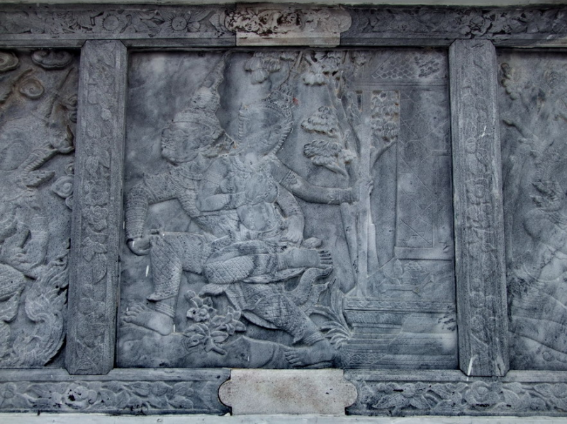 สนใจภาพรามเกียรติ์สลักหินอ่อนที่วัดพระเชตุพนมานานแล้ว และด้านล่างภาพมีแผ่นหินอ่อนสลักอักษรกลอนประดับไว้ด้วย เดิมน่าจะมีการถมดำไว้ให้อ่านง่าย ๆ แต่ปัจจุบันบางแผ่นถูกเปลี่ยนซ่อมแทนของเดิม แต่เป็นแผ่นเรียบไม่จารึกกลับคืน บางแผ่นแตกเสียหาย บางแผ่นตัวอักษรถูกน้ำฝน ถูกลมซัดจางหายไป น่าเสียดายมากเลย