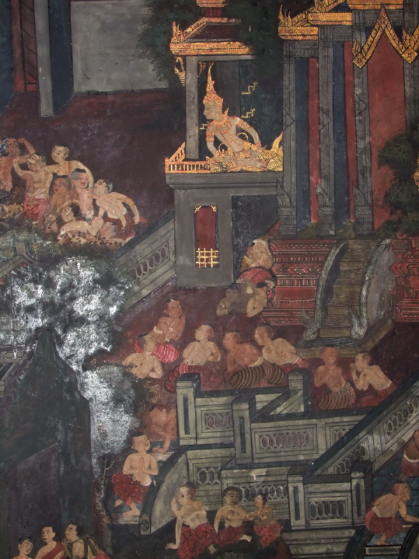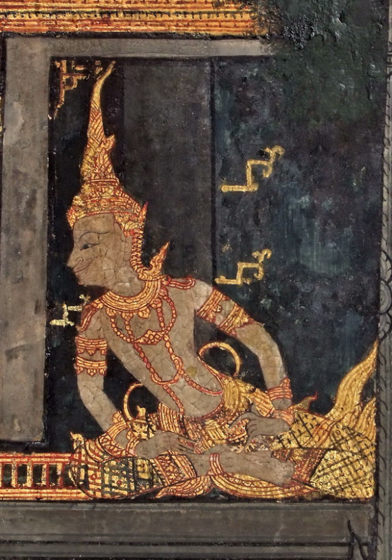 หมายถึงภาพพระเนมีราชตอนเยี่ยมชมขุมนรกรึเปล่าครับ ไอ้สองตัวนั่นมิใช่ลิงครับ ผีครับ ส่วนสตรีในภาพก็คงปีนต้นงิ้วเพราะมักมากในกามนะครับ ดูรามสูรกับเมขลามุมบนขวาซ้ายซิครับ เมขลาไปเขียนทับเสียหมดงามส่วนรามสูรยังพอหลงเหลือความงามอยู่บ้าง การจัดองค์ประกอบของภาพตอนเนมีราชนี้ เห็นว่าแบบครูที่ช่างในสมัยรัชกาลที่๓นิยมเขียนเอาแบบอย่างน่าจะเอาเยี่ยงจากฝีมือของหลวงวิจิตรเจษฎาที่วัดสุวรรณารามเป็นแน่
