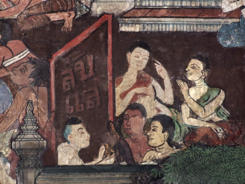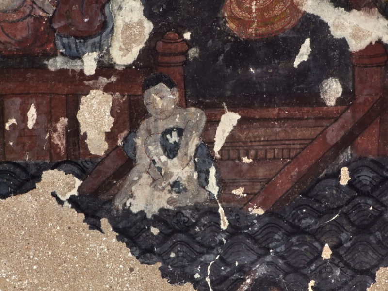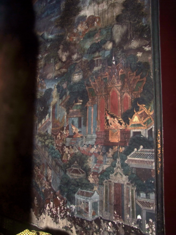 ภาพนี้อยากให้ดูความมักง่ายของ(ไม่อยากเรียกว่าช่าง)ผู้ที่เข้าไปทำการอนุรักษ์จิตรกรรมฝาผนังตอนนี้ตัวภาพถูกเขียนทับจนเละเหลือของเดิมอยู่หน้าดียวให้เปรียบเทียบความสวยงามกับความอุบาทว์ชาติชั่ว(ขออภัยที่หยาบ) แม้กระทั่งลับแลมันยังลบลวดลายที่ควรมีไปเขียนตัวหนังสือว่าลับแลให้ผู้ดู(ที่มาพบภายหลัง)ให้รู้วานี่แหละคือลับแลไม่รู้มันเอาอะไรคิด ให้ไปดูจิตรกรรมฝาผนังที่มีฉากลับแลในสมัยรัชกาลที่3-4เถอะเขียนเป็นเรื่องราวตัวเล็กๆอย่างเรื่องสามก๊ก(ดูได้ที่วัดสุทัศน์)และรามเกียรติ์(ดูได้ที่วัดกันมาตุยาราม)งดงามมาก