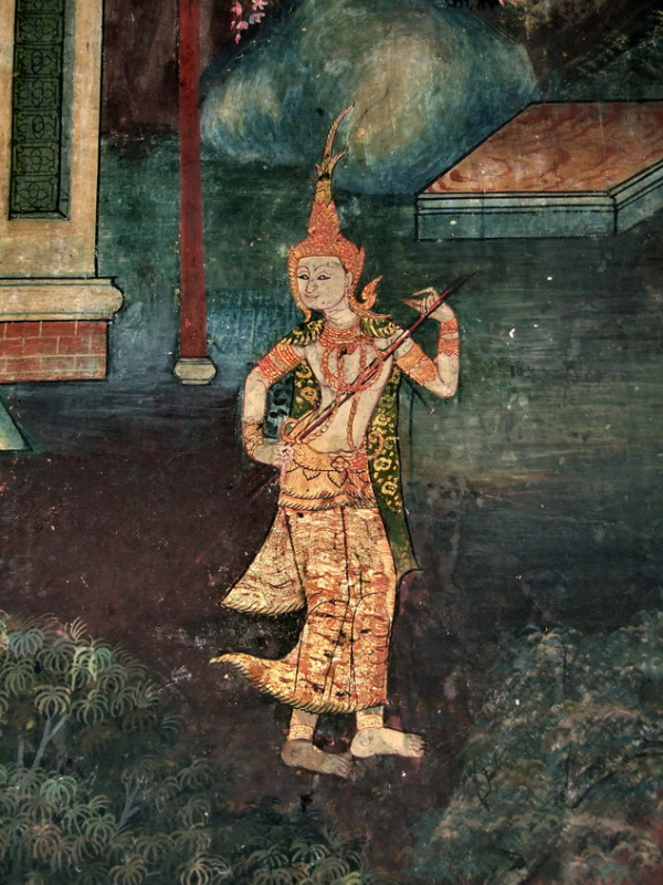 ภู่กันคงเป็นภู่กันแบบโบราณของไทยนะครับม่ใช่ภู่กันจีน ส่วนทีเขียนต้นไม้ก็ใช้เปลือกต้นกระดังงามาทุบปลายให้แตกไว้เขียนแบบภาษาช่างเรียกว่า"ประกระทุ้ง" จิตกรรมฝาผนังสมัยรัชกาลที่๓มีอิทธพลจีนปนอยู่มากก็พบได้แทบทุกวัดอย่างที่คุณsiamsesพูดถึงก็เป็นส่วนหนึ่งครับ ไอ้ทีพระเตมีย์ถืออยู่นั้นมิใช่ปืนนะครับ แต่เป็นไม้กวาด คนซ่อมมันคงไปลบตรงตัวไม้กวาดทิ้งไปตอนซ่อมด้วยความไม่รู้ดูเปรียเทียบได้จากจิตรกรรมวัดบางยีขันที่แบบรูปประกอบมานี้
