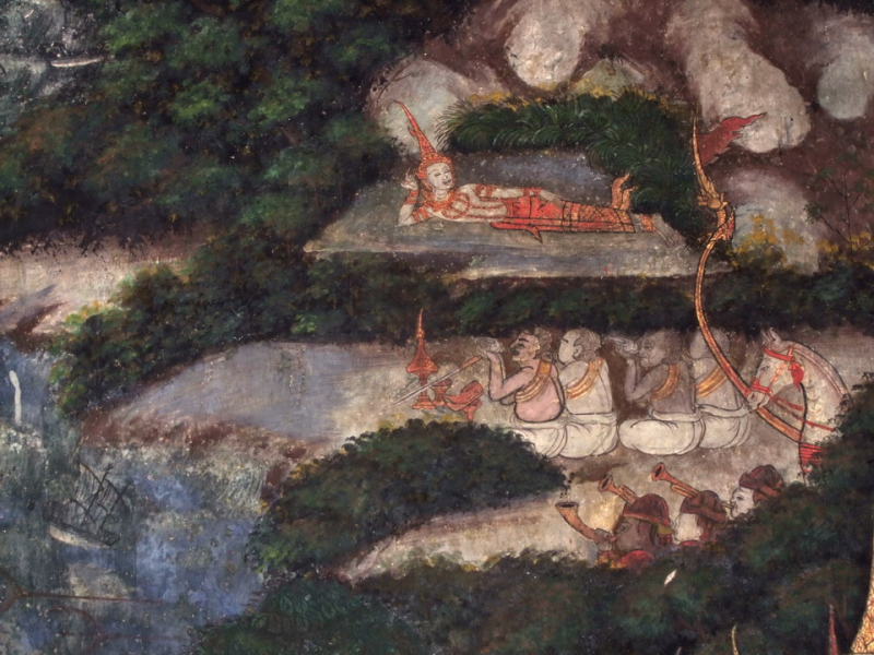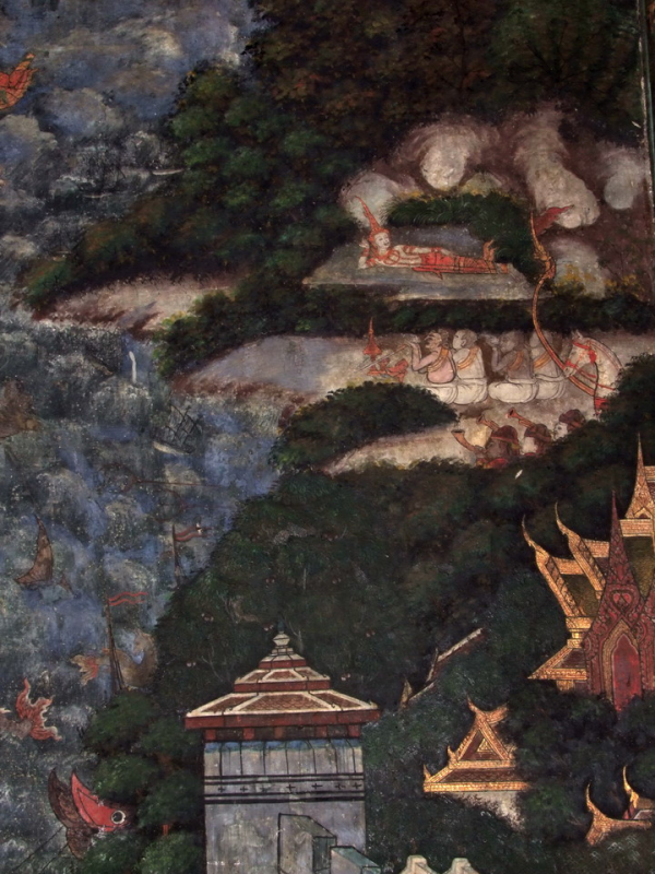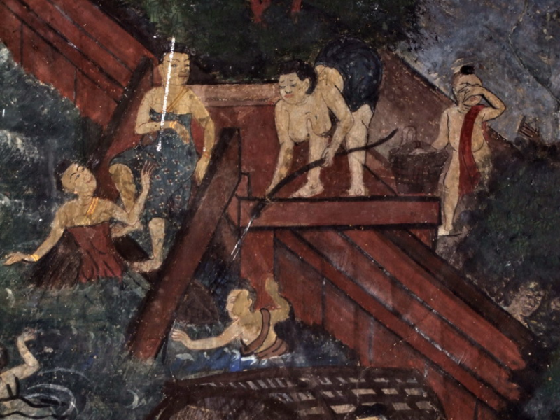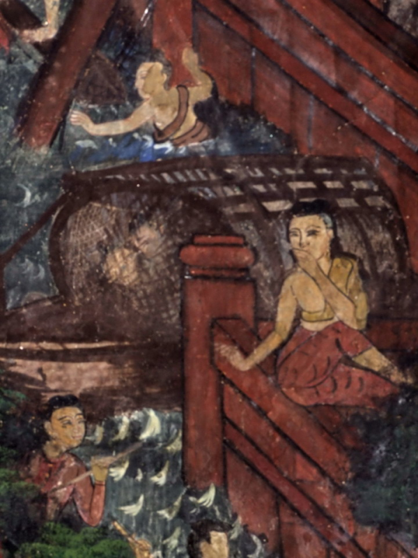 ดูหนุ่มสาวที่แอบซ่อนตัวอยู่ในเรือ แอบทำกุ๊กกิ๊กกัน เสียดายว่าช่างคงกลัวจะประเจิดประเจ้อเกินไปเลยเขียนเป็นมุ่งบังซะฉิบ เสียดาย น่าจะถูกใจคุณเพ็ญชมพูนะครับ อีกภาพเป็นมหาชนกว่ายน้ำกลางมหาสมุทรมากว่า๗วันจนนางมณีเมขลาเห็นในความเพียรเหาะมาช่วยไว้ เรือสำเภานั้นเขียนเป็นเรืออย่างฝรั่งดูงามตาไปอีกแบบ ผมแปลกใจตรงการแต่งกายของลูกเรือนี่แหละที่เป็นชุดขาวใส่หมวกคลุมหัวอย่างอิสลาม ทำไมเป็นอย่างนั้น หรือช่างจะเขียนตามการแต่งกายของลูกเรือฝรั่งสมัยนั้น
