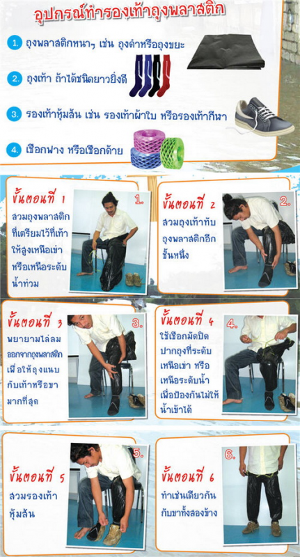 ใช้ถุงพลาสติกอย่างหนาบรรจุน้ำแล้วรัดหนังยาง หลังน้ำลดเก็บไว้ใช้ใหม่ได้