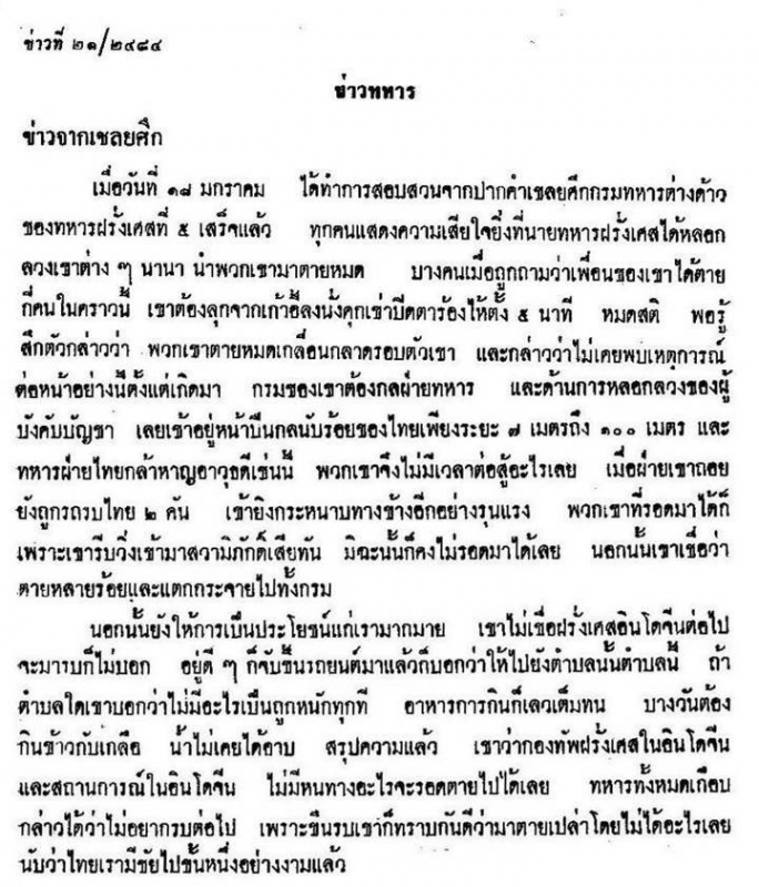 เมื่อกองทัพบูรพาของไทยมีชัยชนะต่อทหารฝรั่งเศส โดยกองพันทหารราบที่๓ของกองพลพระนครทำลายกองพันที่๓กรมทหารต่างด้าวที่๕ลงอย่างสิ้นเชิง กองบัญชาการทหารสูงสุดได้ออก“ข่าวทหาร”ให้ประชาชนทั่วไปได้ทราบเป็นระยะๆ โดยข่าวแรกออกในวันที่๑๖ มกราคม อันเป็นวันที่ปะทะกันดังนี้