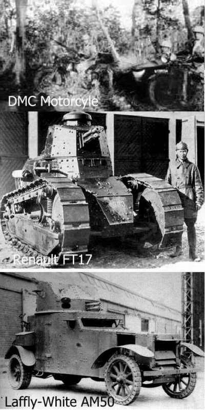 Détachement Motorisé de Cochinchine (DMC - Cochinchina Motorised Detachment) Commander : Captain Aguesse หน่วยยานยนต์แห่งโคชินจีน ผบ.หน่วย ร้อยเอกอาเกสส์ ยุทโธปกรณ์ จักรยานยนต์ รถถังแบบRenault FT17 รถรบแบบ Laffly-White AM50