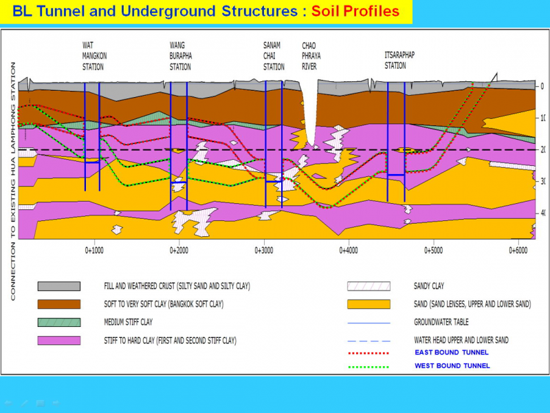 ลักษณะของชั้นดินจากการขุดเจาะสำรวจจากสถานีหัวลำโพงจนถึงสถานีท่าพระในแนวเส้นทางก่อสร้าง ประมาณได้ดังภาพ