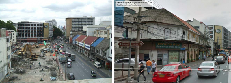 ภาพซ้ายมือถ่ายโดยลุงไก่ จากอาคารสูงลงมายังอาคารเก่าซ้ายมือถนนมหาไชย ซึ่งเดิมเป็นที่ตั้งห้องแถวเก่า และโรงหวยด้านหลัง ซึ่งอนาคตจะเป็นสถานีรถไฟฟ้าวังบูรพา