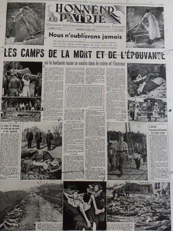 ภาพนี้เป็นหนังสือพิมพ์ฉบับภาษาฝรั่งเศส ตีพิมพ์เมื่อวันที่ 29 เมษายน ค.ศ. 1945