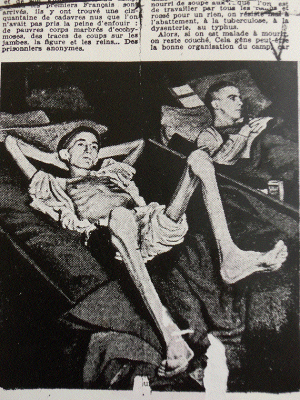 ^ ^ ภาพนี้เป็นภาพหน้าปกหนังสือ LIFE บรรยายว่า Pvt. Joe Demler, a prisoner of the Germans for 3 mos., in pajamas w. sleeves & pantlegs rolled up, revealing his skeleton-like limbs as he lies on cot next to another unident. ex-prisoner after they were liberated by Allied forces. April 1945, Germany.