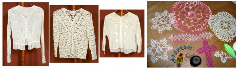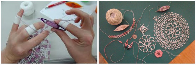 ข้างล่างคือการถักแท้ตติ้ง เครื่องมือที่ใช้เป็นกระสวยอันเล็กๆ รูปร่างเหมือนใบไม้เรียวๆสองใบประกบกัน พันไหมรอบนิ้วแล้วถักโดยอาศัยกระสวยถักไหมให้พันต่อกันเป็นลายลูกไม้ เมื่อถักเป็นแล้ว สามารถทำลูกไม้ได้เป็นเส้นยาวๆ นำมาขลิบริมผ้าเช็ดหน้าอีกทีหนึ่ง นอกจากนี้ยังทำเป็นลูกไม้แผ่นรองขวดน้ำอบบนโต๊ะเครื่องแป้ง หรือคนเก่งๆทักแท้ตติ้งต่อกันเป็นเสื้อลูกไม้ได้ทั้งตัว