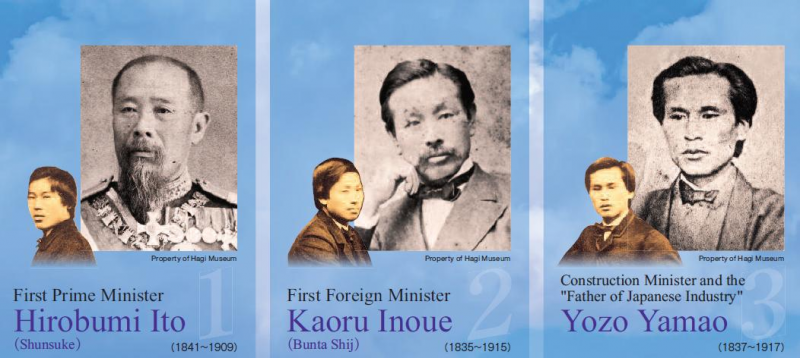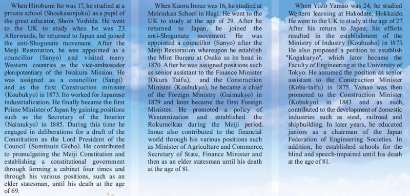 แถวบน  Endo Kinsuke 遠藤謹助 (head of national mint, Zoheikyoku) Nomura Yakichi 野村弥吉 (later Inoue Masaru, the first Director of Railways in Japan) Ito Shunsuke 伊藤俊輔 (later Ito Hirobumi, Prime Minister)
