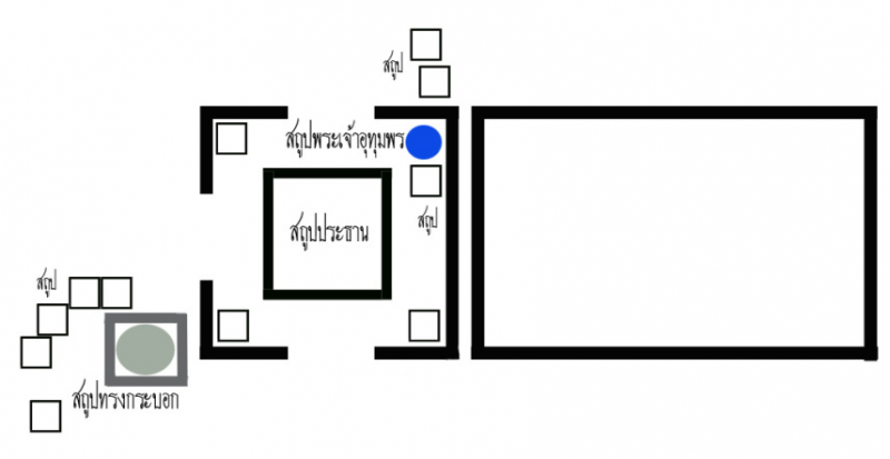 แผนผังประกอบเพื่อให้ทำความเข้าใจในเบื้องต้นว่า สิ่งก่อสร้างของสถูปพระเจ้าอุทุมพร ตั้งอยู่บริเวณใด (วงกลมน้ำเงิน) ซึ่งอยู่ริมกำแพงแก้วของสถูปประธาน