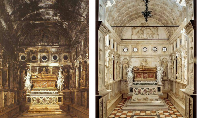 เรียงรายรอบโลงคือรูปสลักผู้ประกาศข่าวประเสริฐ (Evangelist) ที่ส่วนหนึ่งเป็นฝีมือ ของ A. Vittoria เหล่ารูปสลักและรูปนูนประดับประดาได้ถูกจัดวางอย่างเข้าที่ทางกลมกลืนรับกับสมดุลย์ ของโครงสถาปัตยกรรมและเพดานโค้งตามแนวคิดโบราณ