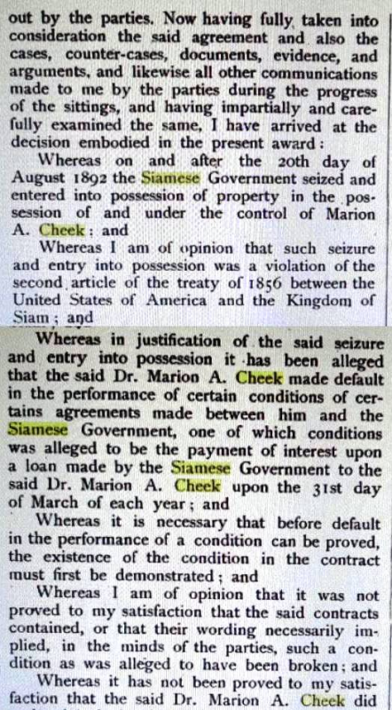 ดิฉันไม่รู้ภาษากฎหมาย     เท่าที่อ่านจากคุณนวรัตนแปลมา   เหมือนกับว่าข้อเท็จจริงที่หมอชี้คผิดสัญญาไม่จ่ายดอกเบี้ยไปกู้จากรัฐบาลสยาม ซึ่งมีกำหนดจ่ายทุกวันที่ ๓๑ มีนาคมของแต่ละปี  เป็นเรื่องที่อนุญาโตคนนี้ตัดสินว่า สัญญานั้นไม่มีจริง  หรือต่อให้มีจริง ทางฝ่ายสยามก็ไม่ได้นำมาแสดงเป็นหลักฐานในสำนวน   ทำให้ยกมาอ้างไม่ได้ที่ไปยึดทรัพย์เขา