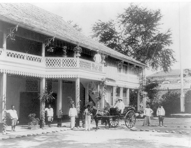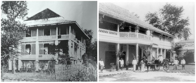 ขอเสนอว่า บ้านทางซ้ายคือบ้านกงสุลฝรั่งเศสหลังเดิม คงปลูกมานานพอสมควร ทำให้โอบาเรต์บ่นว่าโทรมแล้วขอเงินรัฐบาลฝรั่งเศสปลูกใหม่ ทนอยู่บ้านกระจอกๆให้เสียศักดิ์ศรีเจ้าอาณานิคมไม่ได้ ส่วนทางขวาคือบ้านกงสุลอังกฤษ ดูโอ่อ่าหรูหรากว่ามาก ค่ะ