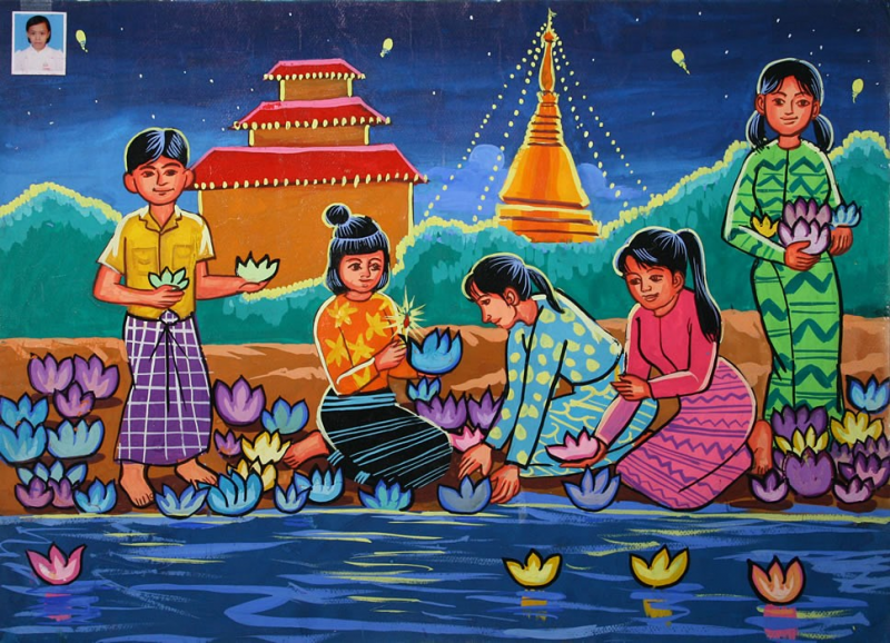 วันนี้เป็นวันลอยกระทงของไทย ตรงกับเทศกาลดะซองดาย Tazaungdaing ในวันเพ็ญเดือน ๘ ของพม่า คือเดือนดะซองโมง Tazaungmon เป็นการฉลองสิ้นสุดเทศกาลกฐินของพม่า มีการตามประทีปตามวัดวาอารามต่าง ๆ ภาพวาดเทศกาลดะซองดายของหนูน้อย Ma Khing May Thu วัย ๑๒ ขวบ ดูคล้ายเทศกาลลอยกระทงบ้านเรา ภาพจาก http://www.narita-childart.jp/file/e11w_mya.html