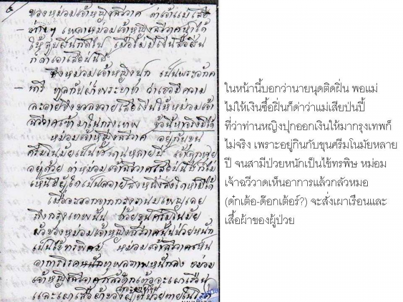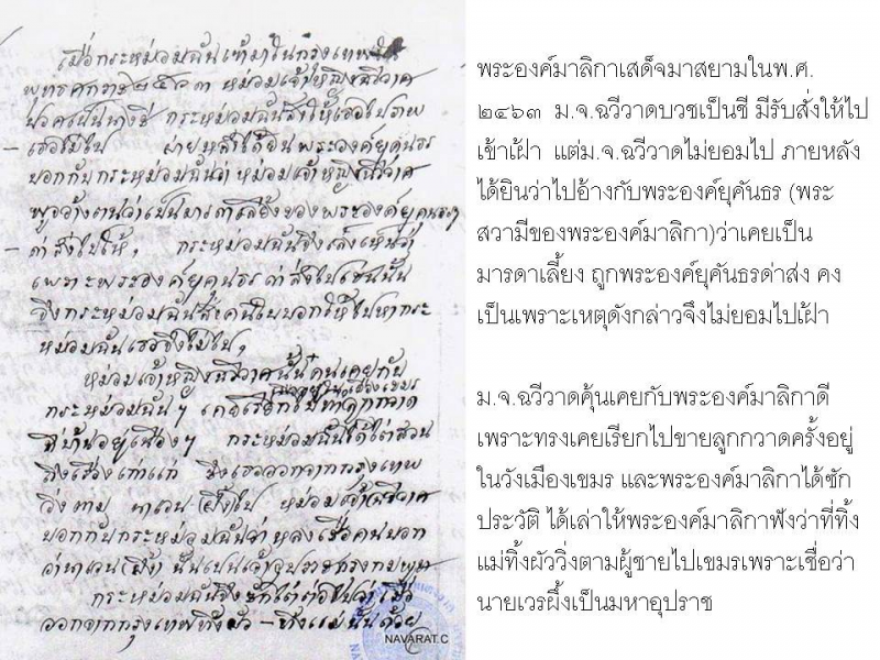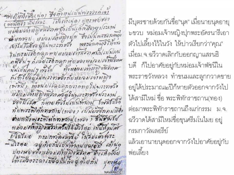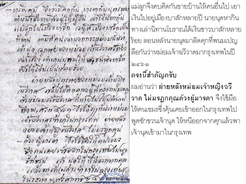 มีความเป็นไปได้อย่างมากว่า ที่พระองค์หญิงมาลิกาเขียนว่าไม่มรฎกคุณด้วงผู้มารดา อาจจะผิดพลาดไป ถ้าเปลี่ยนจากไม่ เป็นได้ ข้อความจะสมบูรณ์ เป็นว่า ภายหลังหม่อมเจ้าหญิงฉวีวาด ได้มรฎกคุณด้วงผู้มารดา จึง(มีเงินมีทอง)ใช้มือให้คนเขมรซึ่งคุ้นเคยเข้าออกในกรุงเทพไปพูดชักชวนเจ้านุด ให้หนีออกจากคุกแล้วพาเจ้านุดเข้ามาในกรุงเทพ