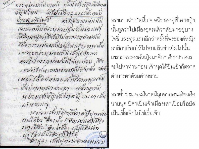 ใครที่อ่านหนังสือที่พระองค์เจ้ามาลิกาทรงเขียนถวายสมเด็จกรมพระยาดำรงแล้วไม่เชื่อ จะด้วยหาว่าทรงมีอคติกับม.จ.ฉวีวาดด้วยเหตุใดก็แล้วแต่ ก็ยังมีจดหมายของนายพานดุรีเองที่เขียนมากราบทูลพระกรุณาสมเด็จกรมพระยาดำรง ข้อความสอดคล้องกัน ไม่เป็นที่น่าสงสัยอีกต่อไปว่าพฤติกรรมเสเพลตามประวัติของม.จ.ฉวีวาดหมายถึงอะไร ดังนั้นความในข้อ ๔ จึงชัดเจนว่าเป็นความเท็จ ม.จ.ฉวีวาดมิได้เคยเป็นเจ้าจอมหม่อมห้าม หรือแม้แต่ดอกไม้ชั่วคราวที่สมเด็จพระนโรดมทรงดอมดม และบุตรชายก็เป็นเพียงสามัญชน กำเนิดจากเจ้าเมืองแบบผู้ว่าราชการจังหวัด มีเชื้อเป็นคนจีนไม่ใช่เชื้อเจ้าของเขมร