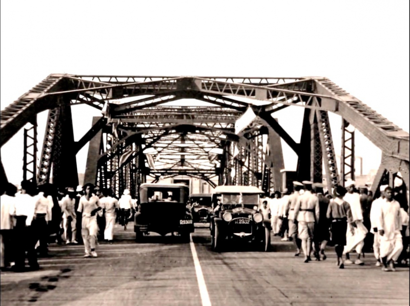 สะพานพุทธ ๒๔๗๕ เห็นพระอุโบสถหลังเดิมวัดเลียบ ต่อมาถูกระเบิดพังในสงครามโลก