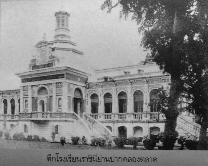 บริเวณปากคลองตลาดมีอาคารหลังคารูปโดมมียอดแหลมขึ้นไปอีกระดับคือโรงเรียนราชินี โปสการ์ดเก่าอาจจะเขียนว่า Royal College