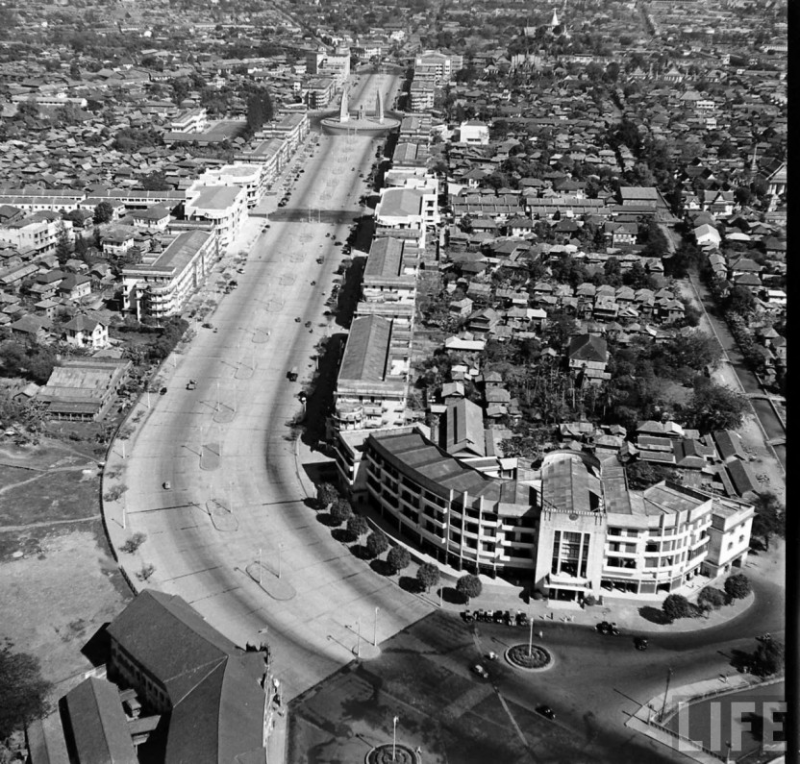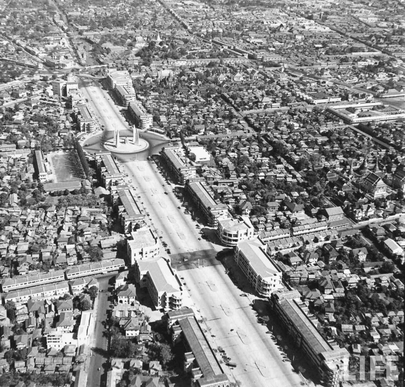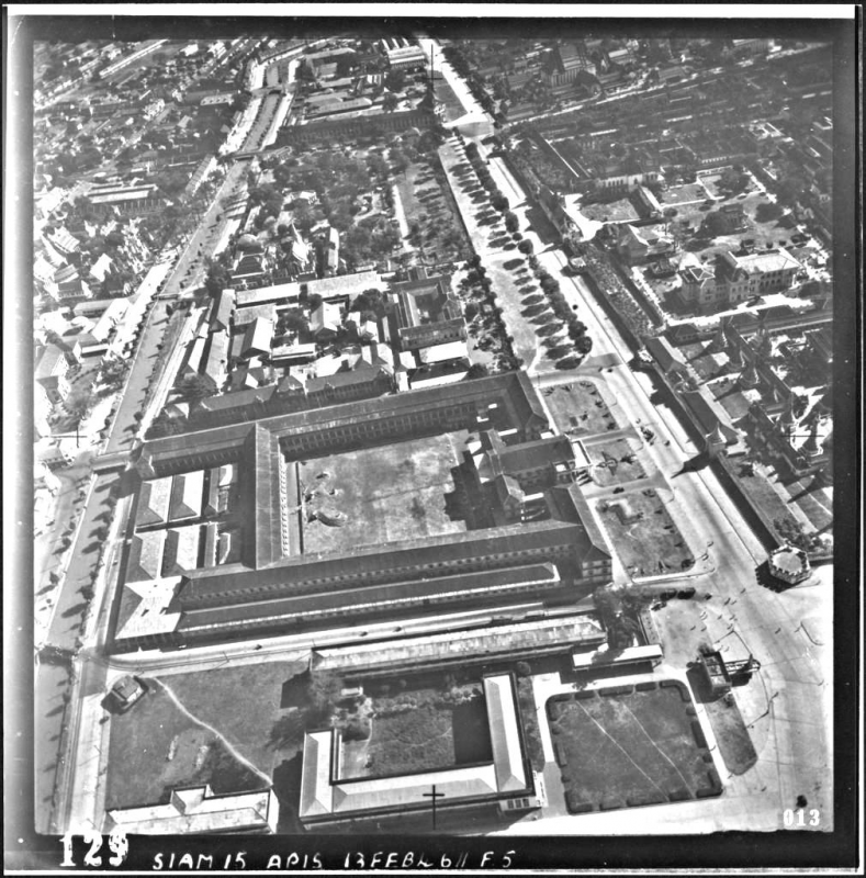 ภาพทางอากาศ ๒๔๙๓ ถนนวรจักรอยู่ล่างสุด วัดพระพิเรนทร์ต่อด้านบน (ลดคุณภาพลงให้คงขนาดใหญ๋) ภาพที่สองถนนราชดำเนินกลาง(คุณภาพ แค่ 40%) ถนนราชดำเนินกลางเห็นโรงแรมรัตนโกสินทร์ คลองผดุงกรุงเกษม สะพานเจริญสวัสดิ์
