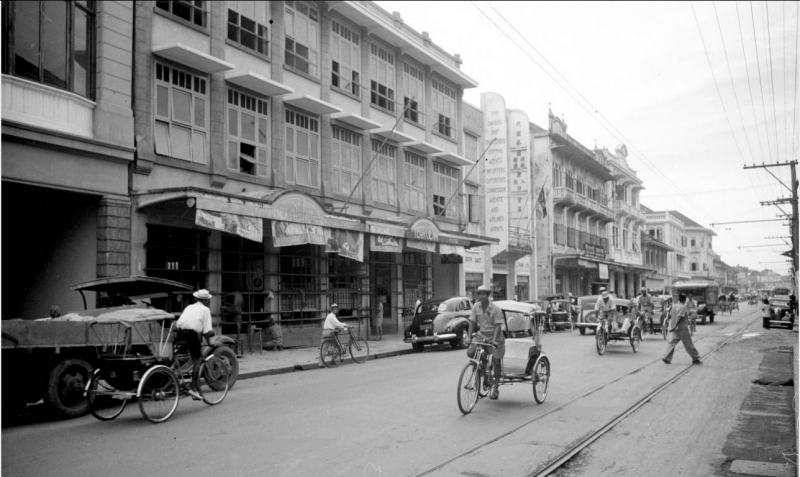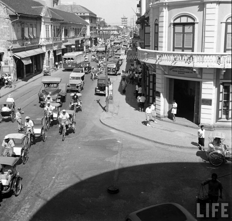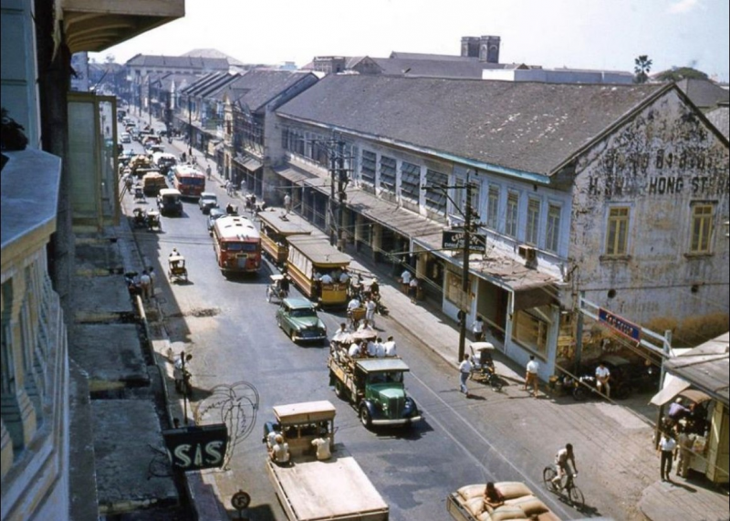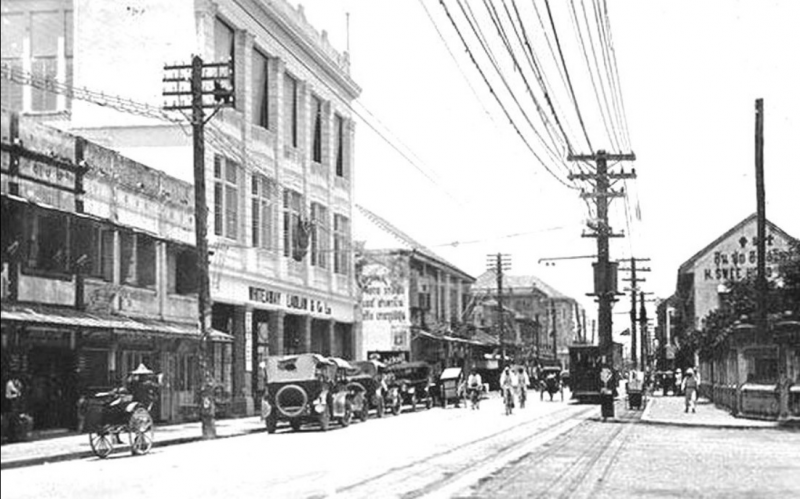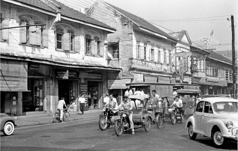 ถนนเจริญกรุง ๒๔๙๙ ใกล้ไปรษณีย์กลางบางรัก ป้ายสีนํ้าเงินตัวสีทองคือวัดม่วงแค ถัดไปด้านบนที่เขียนว่า CENTRAL คือร้านเซ็นทรัลร้านแรกที่ขายหนังสือ ตุ๊กตา เสื้อผ้า ก่อนจะขยายเป็นกลุ่มห้างใหญ่โต