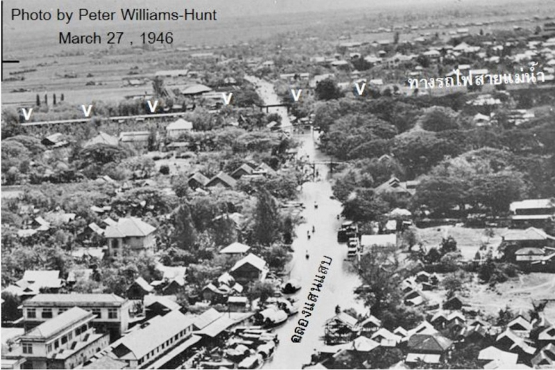 เมื่อดูรูปด้านข้างสะพานเฉลิมโลก มาดูรูปด้านบน ของ William Hunt จะได้ครบกระบวนการไม่ต้องวนกลับไปมา ถ่ายเมื่อเดือน กุมภาพันธ์ - เมษายน 2489 ถนนเพชรบุรีตัดใหม่ยังไม่ได้สร้าง ถนนเพชรบุรีมาตันที่ถนนราชปรารภ ข้างสะพานเฉลิมโลก แนวที่เป็นถนนเพชรบุรีตัดใหม่จะเห็นโรงหนังศาลาเฉลิมโลก