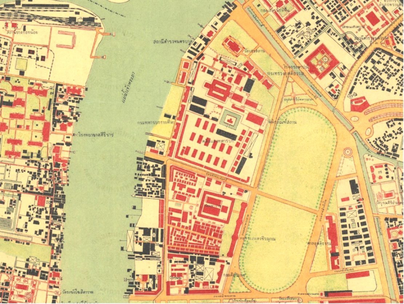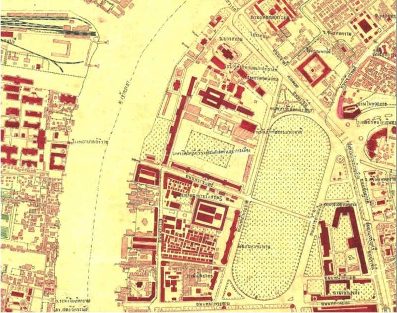 แผนที่ส่วนบนของเกาะรัตนโกสินทร์ แผ่นแรก ปี พศ.2475 แผ่นที่สอง ปี พศ.2490 ในระยะสิบห้าปีมีการเปลี่ยนแปลงหลายอย่าง