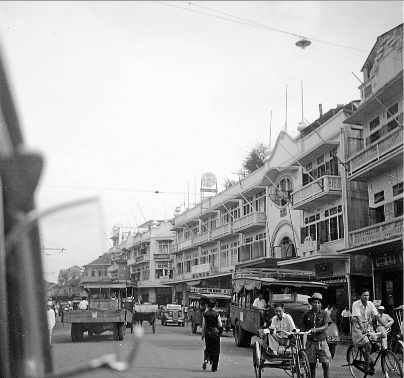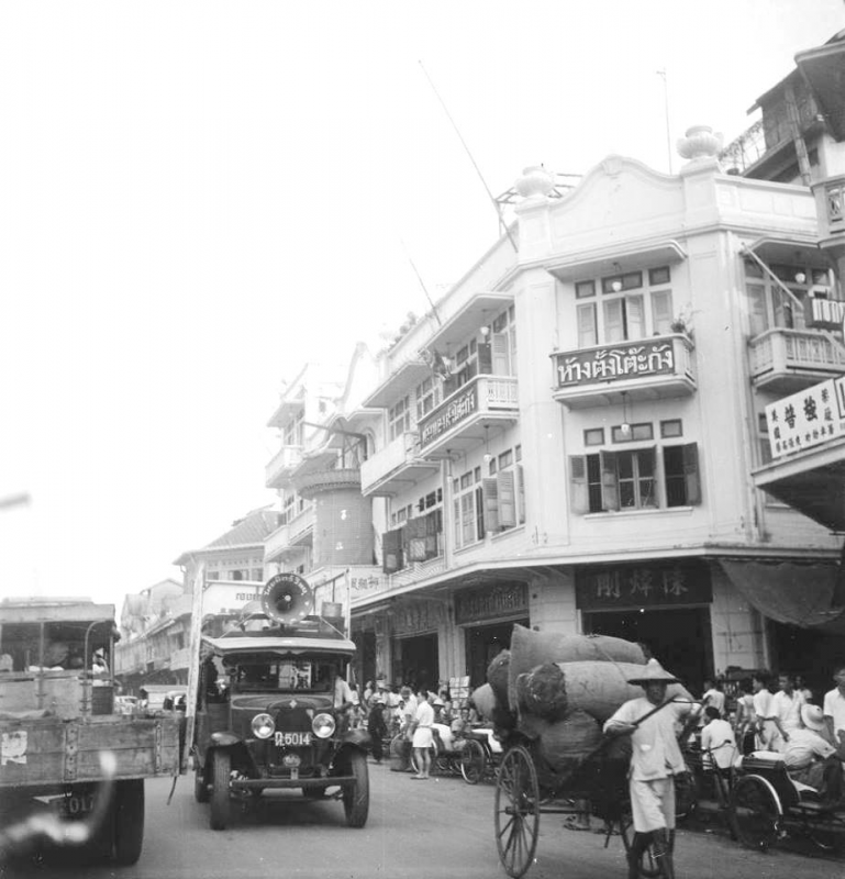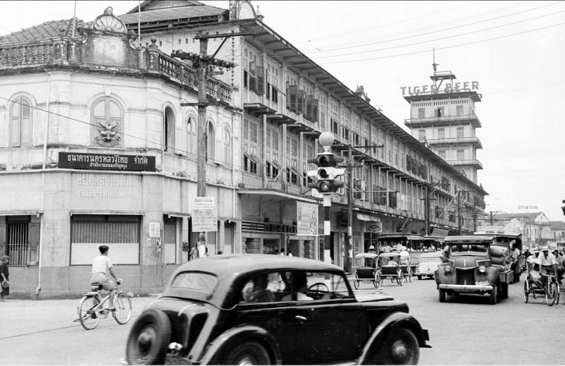 ตลาดน้อย 23 มีนาคม 2491 ถนนเจริญกรุงแถวสี่พระยาเห็นตึกนายเลิศ