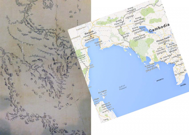หยิบแผนที่วาดบนผ้าไหม ที่กะระยะของเอกสารประมาณสมัยรัชกาลที่ ๑ เป็นแผนที่จากปากแม่น้ำเจ้าพระยา ไปถึงเมืองกวางตุ้ง คงจะช่วยค้นหาได้มากทีเดียว