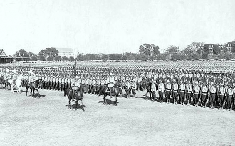เวลา ๔ ล.ท. กองเสือป่าได้เริ่มเดินขบวนเข้าบริเวณสโมสร เวลา ๔.๓๐ ล.ท. พระบาทสมเด็จพระเจ้าอยู่หัวเสด็จถึงสโมสรเสือป่า ทอดพระเนตรการตรวจพลแล้วเสด็จพระราชดำเนินกลับพระบรมมหาราชวัง