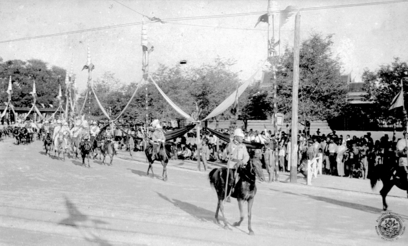 ภาพถัดมาในความเห็นที่ ๙๐ มีนายทหารราชองครักษ์ขึ้นมาเชิญธงไชยกระบี่ธุช พระครุฑพ่าห์น้อย นำเสด็จ ธงไชยนี้ทรงพระกรุณาโปรดเกล้าฯ ให้สร้างขึ้นเมื่อคราวที่ทรงได้รับแผ่นโลหะรูปกระบี่และครุฑ ซึ่งทรงสันนิษฐานว่าเดิมคงจะเป็นยอดคันธงมาก่อน จึงทรงพระกรุณาโปรดเกล้าฯ ให้สร้างธงไชยคู่นี้ใช้นำเสด็จในโอกาสต่างๆ ในสมัยรัชกาลที่ ๖ โปรดให้เชิญธงกระบี่ทางขวาและธงครุฑทางขวา ต่อมาในรัชกาลที่ ๗ สมเด็จเจ้าฟ้ากรมพระยานริศรานุวัดติวงศ์กราบบังคมทูลว่า ตามบันทึกของโบราณนั้นธงครุฑจะต้องอยู่ขวาและธงกระบี่จะต้องเชิญทางซ้าย จึงมีพระบรมราชโองการโปรดเกล้าฯ ให้สลับกันมาแต่บัดนั้น