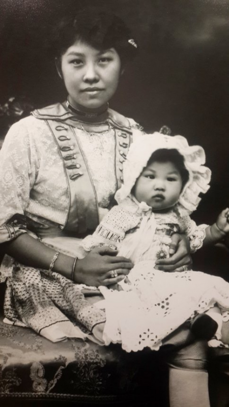 คุณแม่ยังสาวกับทารกน้อย  แต่งกายแบบทารกลูกผู้ดีฝรั่งเต็มตัว