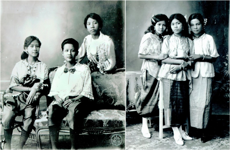 เห็นด้วยค่ะ มาดูกันอีกรูปนะคะ รูปนี้น่าจะถ่ายในรัชกาลที่ ๗ เมื่อแฟชั่นเปลี่ยนแบบจากความหรูหราสง่าอลังการมาเป็นเรียบง่ายแบบยุค 1920s เสื้อคอกว้างแต่ตื้น แขนสั้นไม่ต่อแขก เป็นแพทเทิร์นที่ง่ายมาก เย็บเอาเองก็ได้ มีการเล่นสีสันและดอกดวงลายผ้าแทนผ้าลูกไม้อย่างในปลายรัชกาลก่อน ชายเสื้อผูกชายด้านข้าง นุ่งกับผ้าซิ่น โจงกระเบนหายไปแล้วจากสาวสยาม