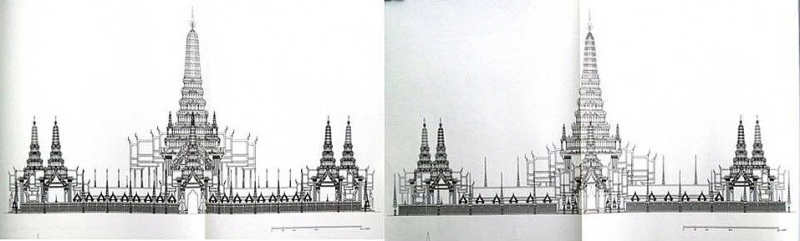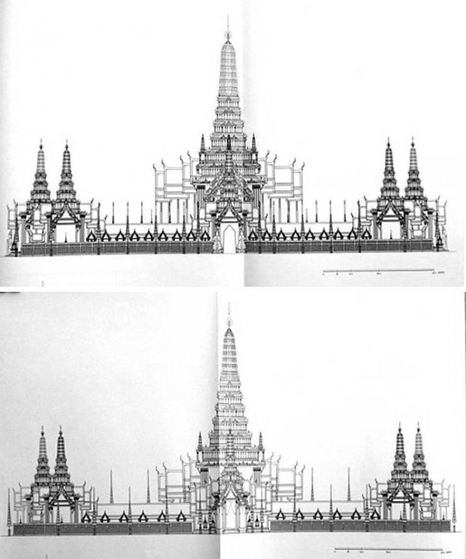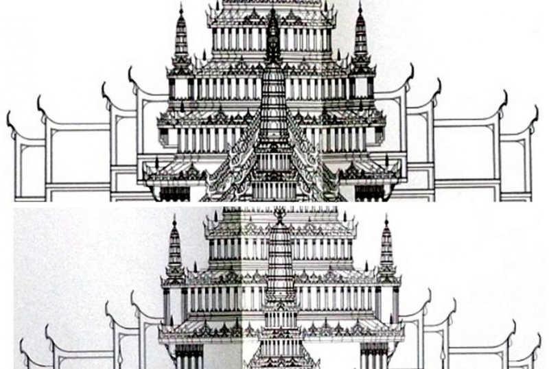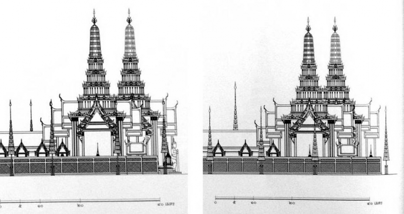 จะเห็นความแตกต่างที่ชัดเจน โปรดสังเกตุจตุรมุข ซึ่งเป็นไปไม่ได้ที่จะปรากฏภาพถ่ายในลักษณะมุมมองเช่นนี้