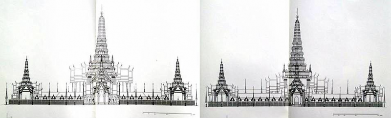 ซ้าย พระเมรุมาศพระจอมเกล้าเจ้าอยู่หัว คอระฆังต่อจากเดิมอีก ๒ชั้น จะถึงเชิงชายหลังคา ขวา พระเมรุมาศพระปิ่นเกล้าเจ้าอยู่หัว คอระฆังต่อจากเดิมอีกชั้นเดียว ก็ถึงเชิงชายหลังคา