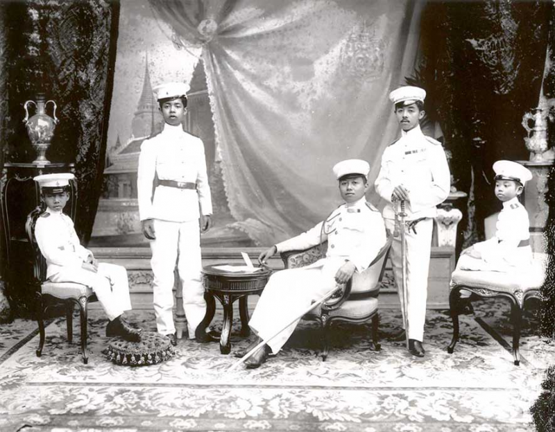 พระราชโอรสในพระบาทสมเด็จพระจุลจอมเกล้าเจ้าอยู่หัว ซึ่งทรงรับราชการทหารในกรมยุทธนาธิการเมื่อ พ.ศ. ๒๔๔๙ (จากซ้าย) ๑. นายพลเอก สมเด็จพระบรมโอรสาธิราชฯ สยามมกุฎราชกุมาร จเรทัพบก และราชองครักษ์พิเศษ ๒. นายพันเอก สมเด็จพระเจ้าลูกยาเธอ เจ้าฟ้าจักรพงษ์ภูวนาถ กรมขุนพิษณุโลกประชานาถ ผู้ช่วยผู้บัญชาการกรมยุทธนาธิการ ๓. นายพันตรี พระเจ้าลูกยาเธอ พระองค์เจ้าบุรฉัตรไชยากร ผู้ช่วยกรมกลาง กรมยุทธนาธิการ ๔. นายพลโท พระเจ้าลูกยาเธอ กรมหมื่นนครไชยศรีสุรเดช ผู้บัญชาการกรมยุทธนาธิการ และราชองครักษ์พิเศษ