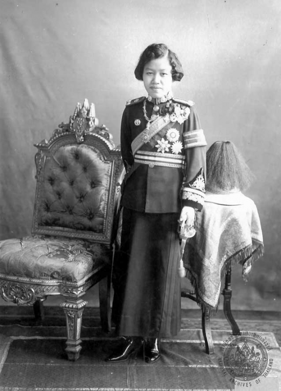 สมเด็จพระนางเจ้าอินทรศักดิศจี พระบรมราชินี ทรงเครื่องเต็มยศนายพันโท ผู้บังตับการพิเศษกรมทหารราบที่ ๑ มหาดเล็กรักษาพระองค์ในพระบาทสมเด็จพระจุลจอมเกล้าเจ้าอยู่หัว  โปรดสังเกตพระมาลา  พระภูษามีแถบเหมือนแถบขากางเกงนายทหาร  และทรงขัดกระบี่ด้วย